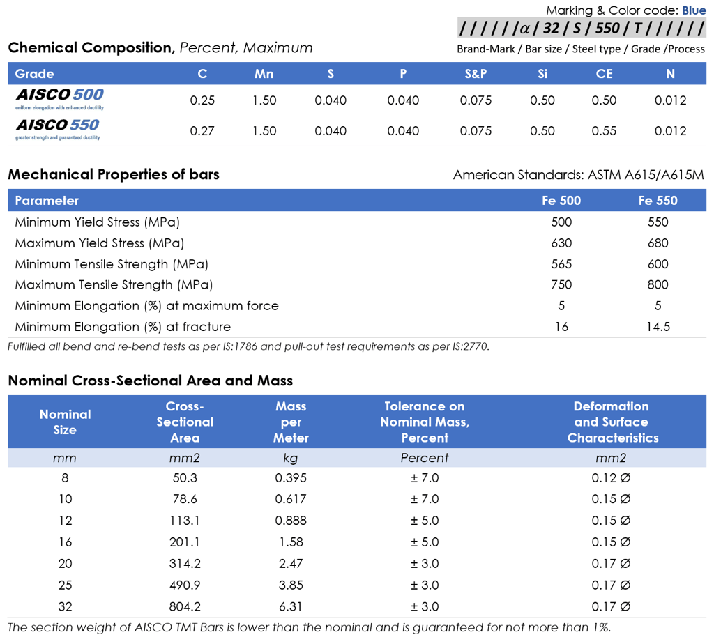 AISCO 500 & AISCO 550 low carbon TMT deformed rebars are the most preferred modern reinforcement material, offering a combination of strength, ductility, and durability, making them ideal for earthquake-resistant and long-lasting structures.