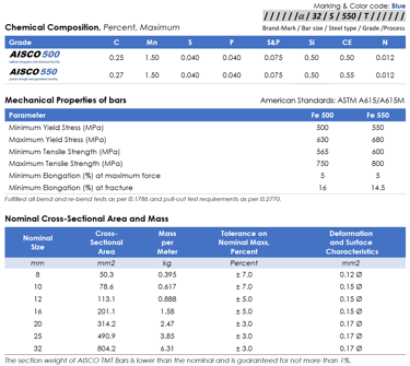 Indian Standards: IS 1786:2008 (Grade Fe 550) = American Standards: ASTM A615/A615M (Grade 80) = Euro Standards DIN 488 (BST 500 M) and = British Standards: BS4449:1997 (GR 460 B)