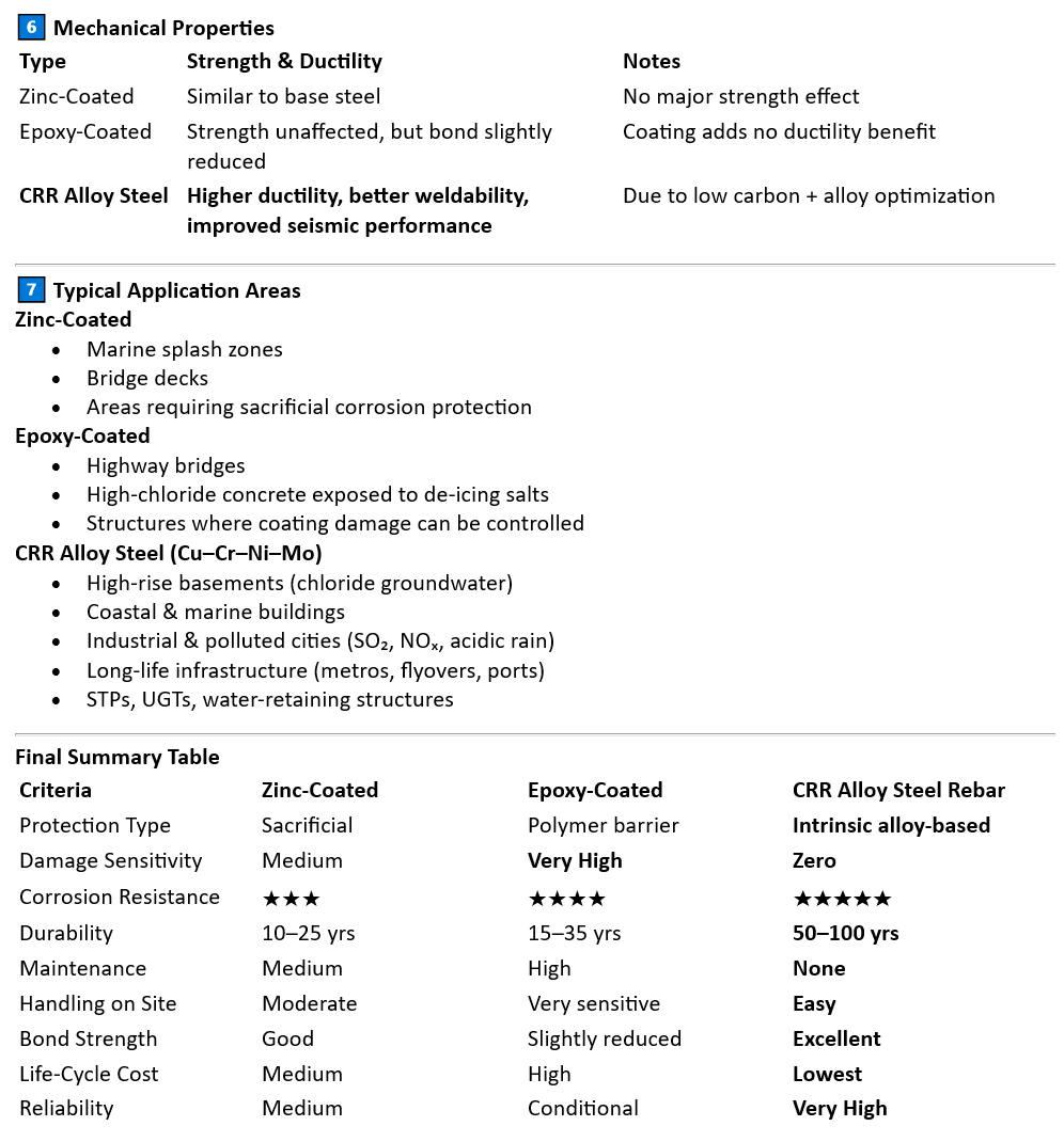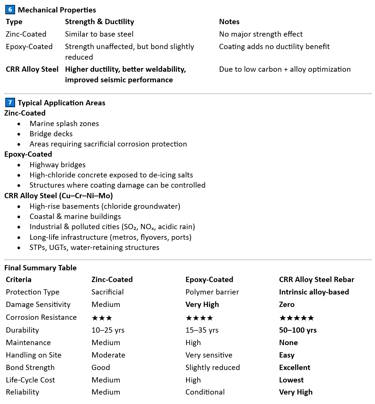 Chromium and Copper improve resistance against chloride, carbonation, and industrial pollution.