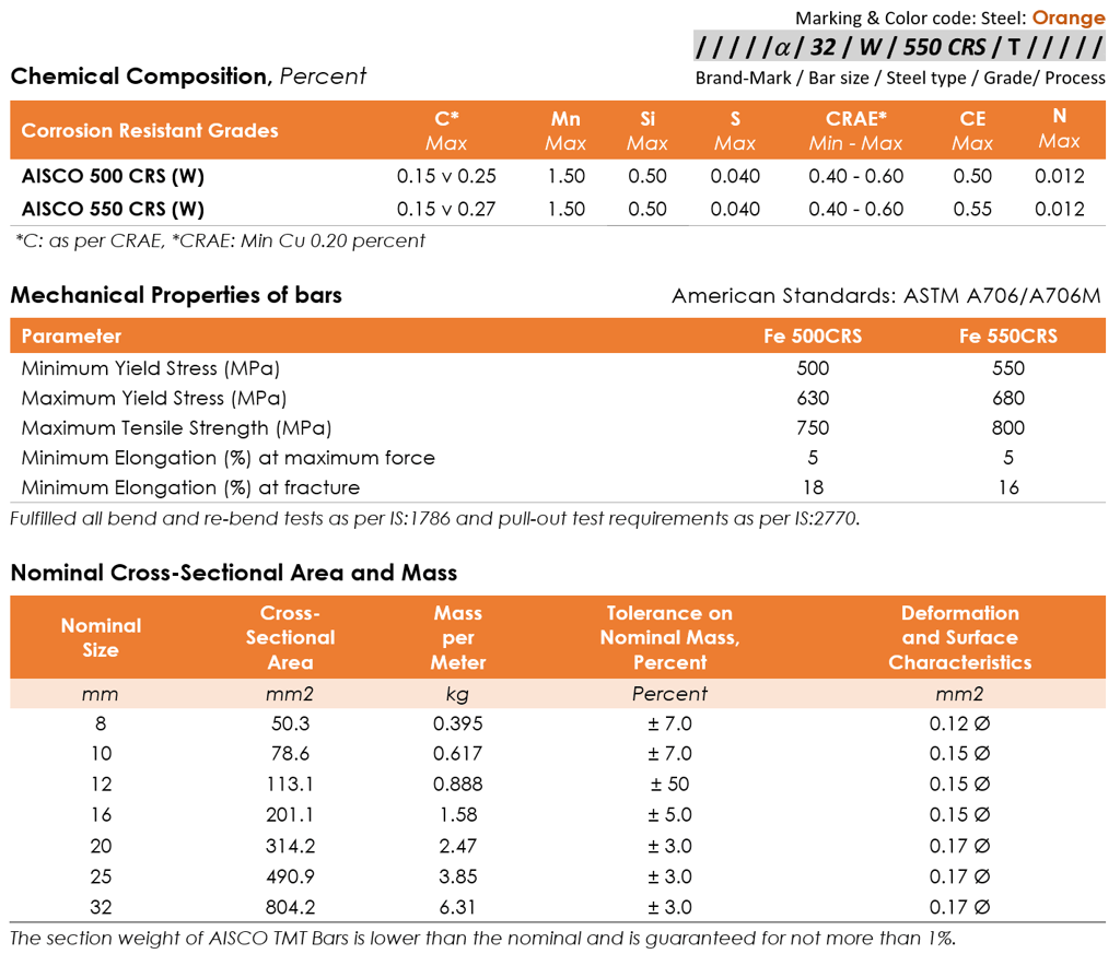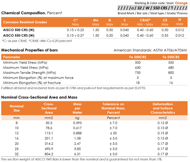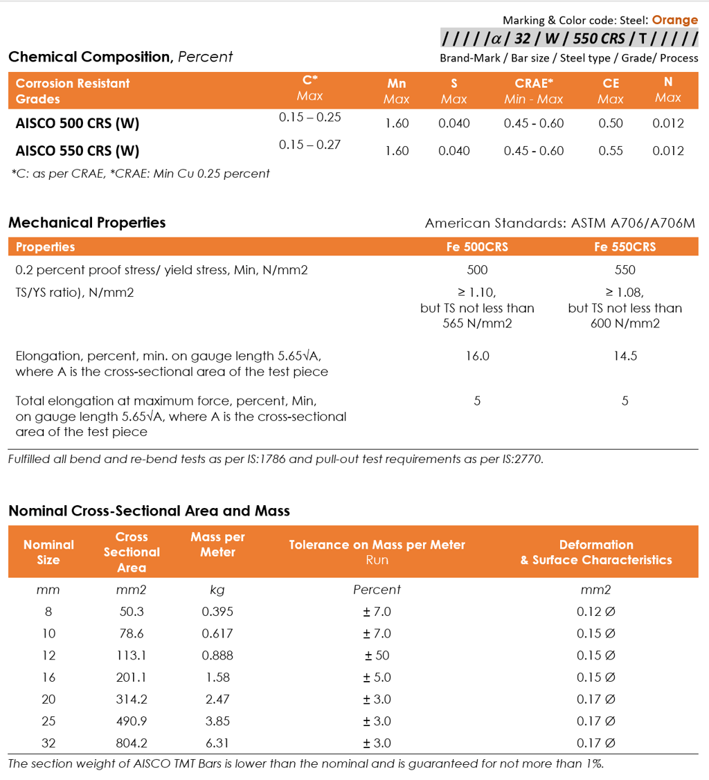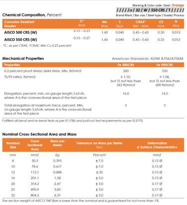 AISCO 500CRS and AISCO 550CRS Corrosion-Resistant Alloy TMT Deformed Steel Rebars