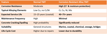 Comparison Table (Normal TMT vs. Corrosion-Resistant TMT)