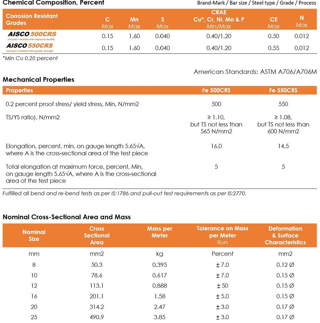 AISCO 500CRS and AISCO 550CRS Corrosion-Resistant Alloy TMT Deformed Steel Rebars
